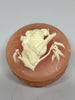 Measures 2 1/2" in diameter x 1 1/2" inches high. Very pretty little round, detailed pink marble jewelry box, with a raised ivory colored Koala Bear and baby cub, cameo on the top. In great vintage condition, no damage, chips or cracks. Light surface wear from age and previous use. (Please see photos)
